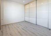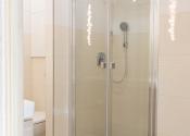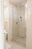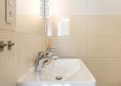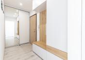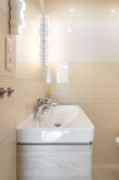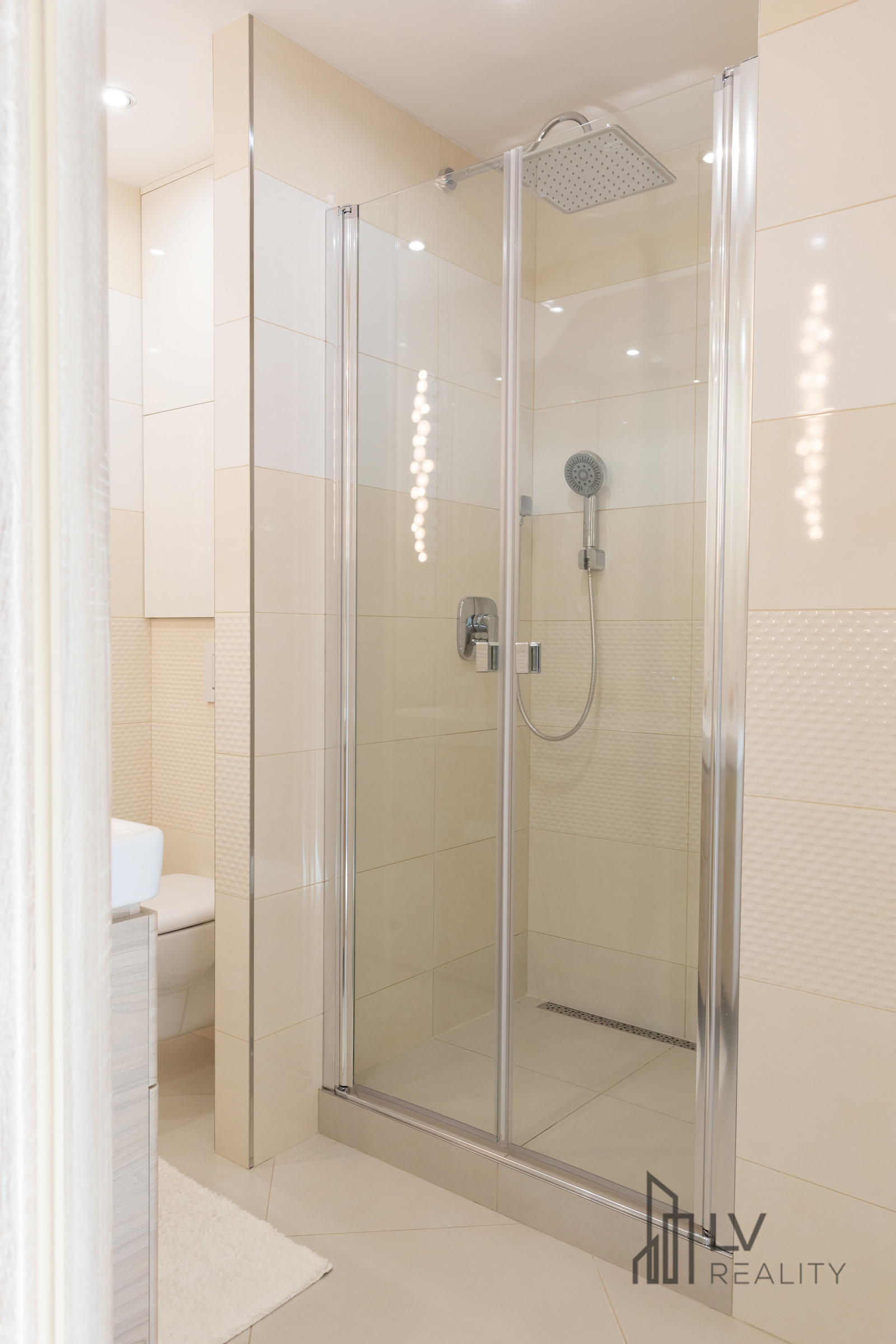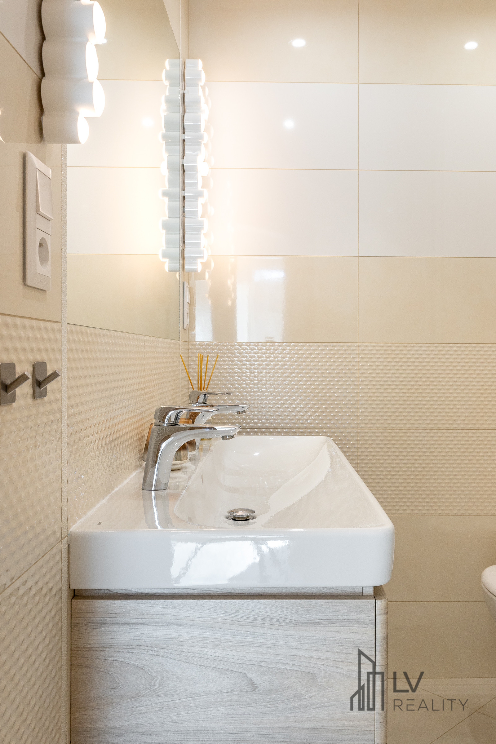 Štýlová kúpeľňa je esteticky zariadená a vybavená dvojitým umývadlom pre väčšie pohodlie. Čistý vzhľad interiéru dotvára aj zabudovaná práčka a sušička.